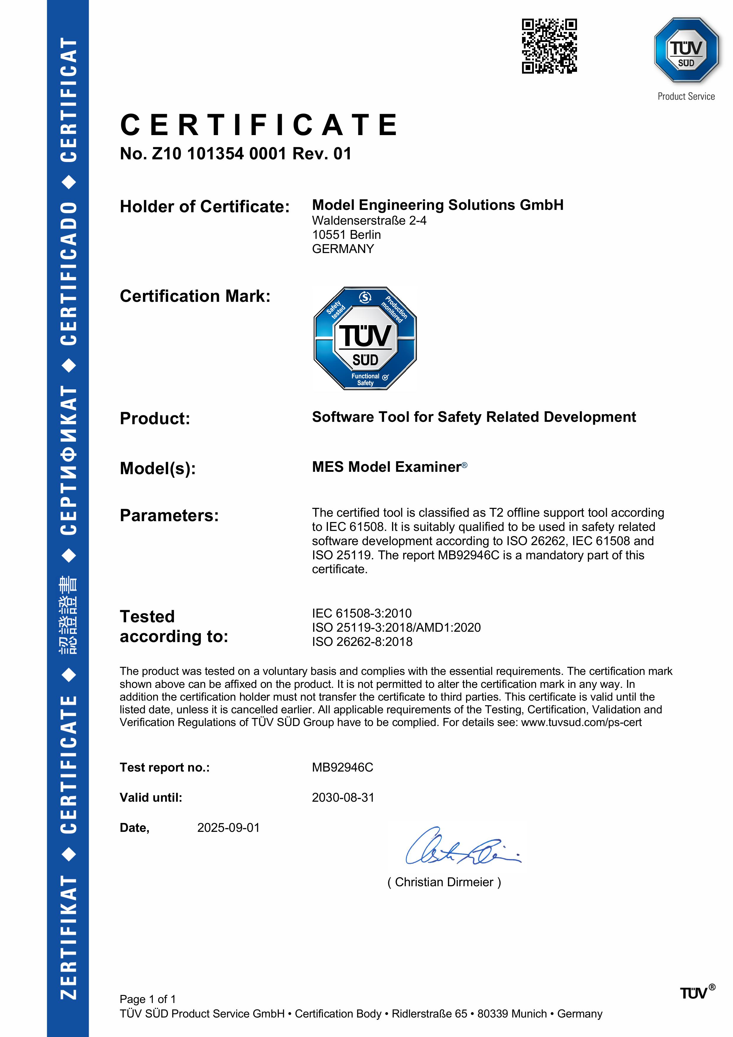 The Model Examiner is certified by TÜV SÜD as a T2 Offline Support Tool for use in safety-relevant embedded software development in compliance with ISO 26262, IEC 61508, and ISO 25119. Designed for function developers, testers, and quality managers in model-based development on the MATLAB®/Simulink®, Embedded Coder®, and TargetLink® platforms.